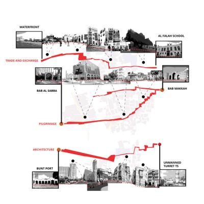 After extensive research, we translated our findings into a series of maps, drawings, and diagrams that made the intangible visible. These visual tools helped reveal opportunities, map spatial patterns, and identify potential art sites across Al Balad.